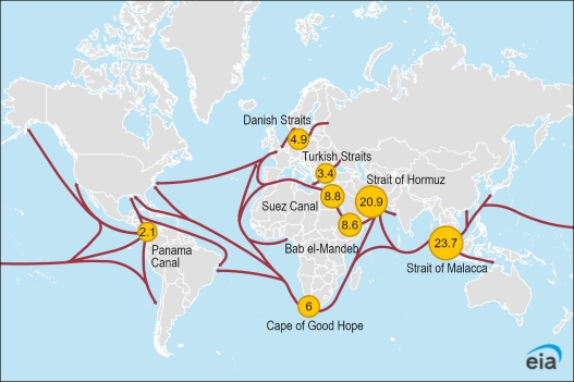 - Nel 2024, dallo Stretto di Hormuz transitavano 20,3 milioni di barili al giorno di petrolio, il Medio Oriente produce il 34,9% delle esportazioni mondiali di petrolio, quota che sale al 42,0% per il petrolio greggio;