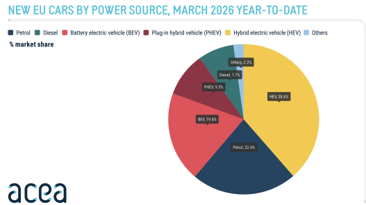 Nel primo trimestre del 2026 sono state immatricolate 546.937 nuove auto elettriche a batteria, pari al 19,4% della quota di mercato dell'Unione Europea, in aumento rispetto al 15,2% dell'anno precedente. Le immatricolazioni di auto ibride, pari a 1.089.421 unità, hanno conquistato il 38,6% del mercato, rimanendo la scelta preferita dai consumatori nell'Unione Europea. La crescita è stata trainata soprattutto dai volumi venduti in Italia (+25,8%) e in Spagna (+18,5%), con un contributo positivo fatto registrare anche da parte di Germania (+7,4%) e Francia (+3,1%). Le immatricolazioni di auto ibride plug-in continuano a crescere, raggiungendo quota 268.344 unità nei primi tre mesi del 2026. Questo incremento è dovuto principalmente alla crescita dei volumi in mercati chiave come Italia (+110,1%), Spagna (+74,2%) e Germania (+19,3%). Di conseguenza, le nuove auto elettriche ibride plug-in rappresentano ora il 9,5% delle immatricolazioni nell'Ue, rispetto al 7,6% del primo trimestre del 2025. Alla fine del primo trimestre del 2026 , le immatricolazioni di auto a benzina sono diminuite del -18,2%, con cali in tutti i principali mercati. La Francia ha registrato la contrazione più significativa, con un crollo delle immatricolazioni del -40,3%, mentre anche altri mercati chiave hanno visto cali in doppia cifra: in Italia la flessione registrata è stata del -18,6%, in Spagna del -18,1% e in Germania del -16,1%. Con 636.502 nuove auto immatricolate negli ultimi tre mesi, la quota di mercato delle auto a benzina è scesa al 22,6% dal 28,7% del primo trimestre 2025. Anche il mercato delle auto diesel continua a seguire un trend negativo, seppur a un ritmo più lento, con un calo delle immatricolazioni del -15,7% e una quota del 7,7% delle nuove immatricolazioni nel primo trimestre 2026. La quota di mercato combinata di auto a benzina e diesel è scesa al 30,3%, rispetto al 38,2% del primo trimestre del 2025.